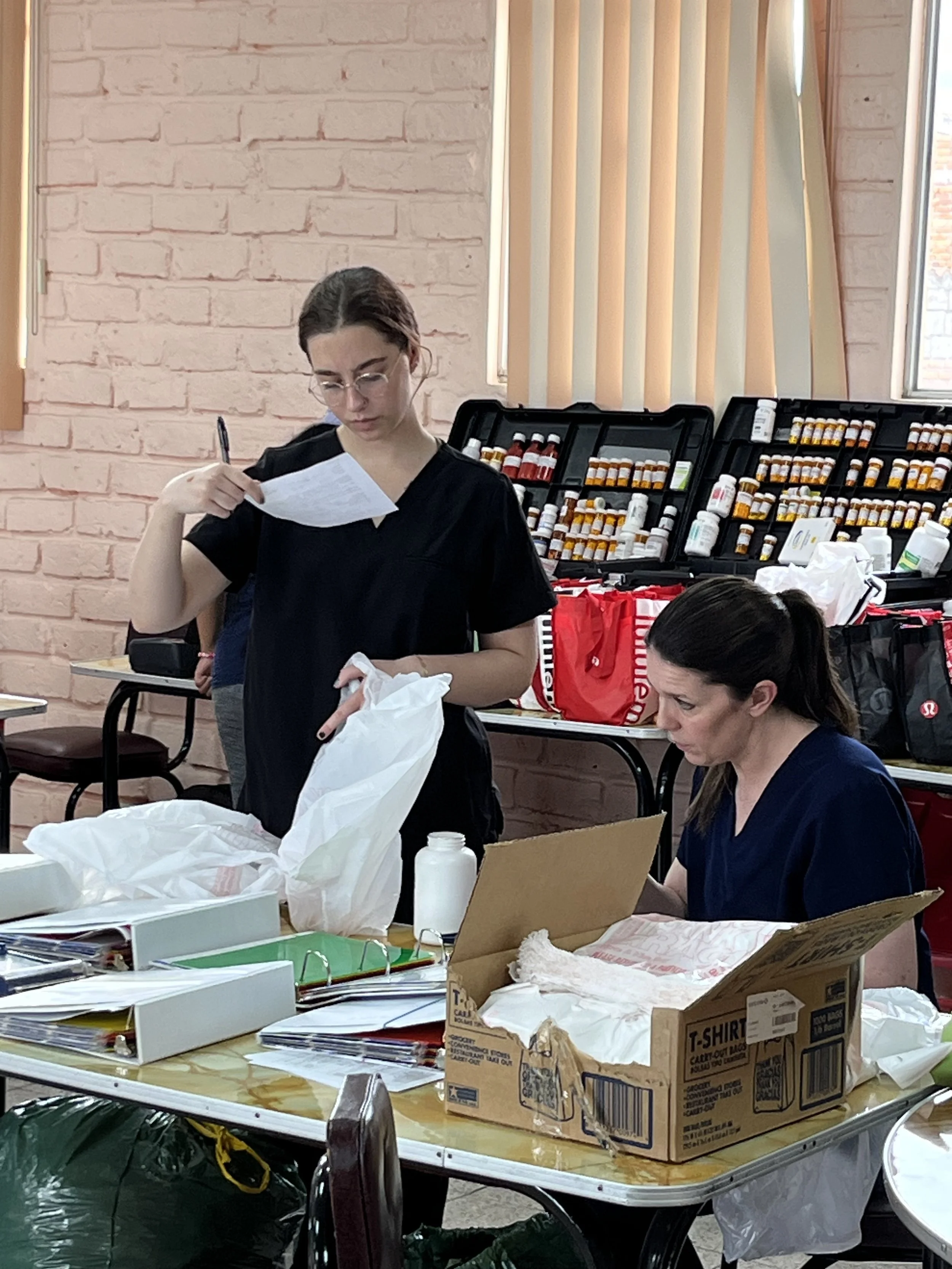 Three of our volunteers are labeling vitamins and pulling medications for the pharmacist.